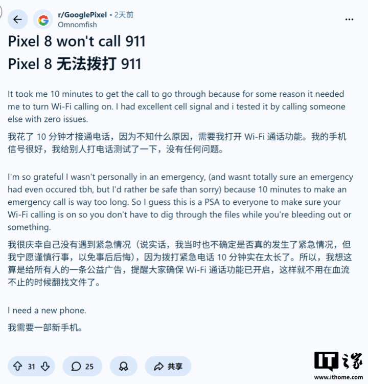 IT之家10月25日消息,科技媒体AndroidAuthority昨日(10月24日)发布博文,报道称多名谷歌Pixel手机用户在Reddit社区反馈,其设备在紧急情况下无法拨通911报警电话。