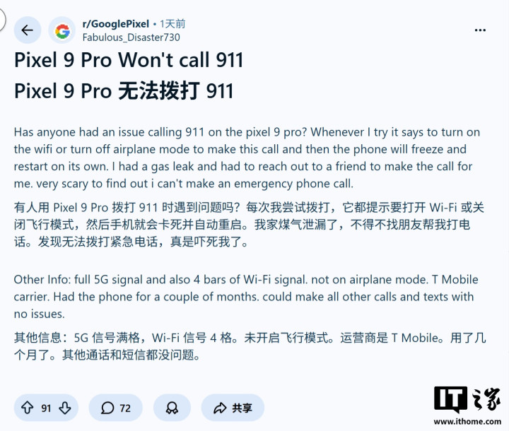 据用户反馈,该问题涉及的机型和运营商范围较广。一名Pixel9Pro用户称,他在尝试拨打911时,手机不仅未能接通,反而直接显示错误信息并自动重启。